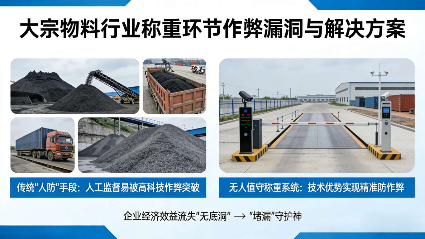 对于煤炭、钢铁、砂石等大宗物料行业而言,称重环节的作弊漏洞是导致企业经济效益流失的“无底洞”。传统的“人防”手段已难以应对高科技作弊,而无人值守称重系统凭借其技术优势,正在成为企业“堵漏”的守护神。 一、常见的作弊手段有哪些? 人工过磅模式下,作弊手段花样繁多:有的司机不完全上磅,利用压边、压角减轻重量;有的通过更换车牌、套牌,实现“一车多过”;更有甚者使用遥控器干扰称重传感器信号,或利用水罐、暗格放水放沙来改变皮重。据估算,严重的作弊行为每年可给企业造成数以千万计的损失。 二、技术如何构筑“防火墙”? 无人值守系统通过“软硬兼施”的策略构建了严密的防线。在硬件层面,安装在秤台前后端的红外光栅是“电子围栏”,只要车辆有一点未进入检测区域,系统就拒绝称重并报警,从物理上杜绝压边行为。多角度的高清摄像机实施全程录像,并在车辆停稳瞬间自动抓拍,重量数据与抓拍图片自动绑定,形成不可抵赖的影像证据链。在软件层面,系统具备“皮重比对”功能。如果本次称重的皮重与历史皮重数据波动超出正常范围(如油箱变化、加装异物),系统会自动拦截并提示人工复核。 三、从防作弊到“零信任”计量 新一代的无人值守系统引入了“数据加密”与“权限管控”。数字式传感器采用加密通讯协议,有效防止遥控器信号入侵。系统后台设有严密的操作日志审计,任何修改计量数据的企图都会被记录在案。通过远程集中计量,司磅员不再接触现场,减少了内外勾结的可能性,实现了“司机与司磅员”的物理隔离。这种技术驱动下的“零信任”机制,真正做到了让每一辆车“阳光过磅”,保障企业利益颗粒归仓。